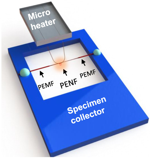 A voltage was applied to the microheater, the tungsten wire temperature increased due to Joule heating, and the collected MF was heated during a ~1 s pulse by convection to make a UHMWPE nanofiber (NF), as schematically shown in Figure 2. Most advanced thermometers have either temporal or spatial resolution limitations that limit direct temperature measurement during this process. We estimated the maximum temperature attained by the fiber during local heating using the ANSYS/FLUENT computational fluid dynamics finite element analysis software package [22]. First, the microheater temperature profile was calculated. Second, we assumed a MF with a typical 3 µm diameter and placed at a distance of 20 µm from the fiber. A potential bias 0.7 V was applied to the heater, as in the experiment. Both convective and radiative heat losses were considered. At the microscale, the boundary layer is smaller than at the macroscale. Thus, the heat transfer coefficient (h) greatly increases. Here, we used = 1000 W m−2 K−1 and emissivity = 0.1 [23]. Figure 3a shows the simulated temperature MF profile. The thermal conductivity of the MF was modeled using gel spun microfibers with = 20 W m−1 K−1 [24]. We used an emissivity value of the MF of 0.2 [25]. A constant thermal conductivity of air, = 0.02 W m−1 K−1, was used. The MF temperature reached 450 K (180 °C), and the temperature profile along the fiber is shown in Figure 3b.