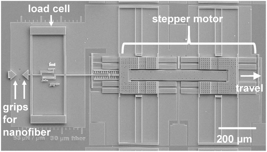A micromachined stepper motor, detailed in [26], was selected for the mechanical measurements. The test platform was designed at Carnegie Mellon University and microfabricated by Sandia National Labs, Albuquerque, NM, USA using the SUMMiT V process [27]. The polycrystalline silicon (polysilicon) motor was “released” in the Carnegie Mellon University nanofabrication facility. The release process involves removing silicon oxide layers in hydrofluoric acid. Then a critical point drying process [28] rendered the structure freestanding. The full platform included a trailing load cell and grips, as seen on the left of Figure 4. The motor was actuated electrostatically, and each step was approximately 60 nm. Here the steps were taken at 1 Hz. It can generate an in-plane force of up to 1 mN, substantially more than the ~100 µN needed to stretch and break the NFs. Subpixel interpolation with approximately 5 nm resolution was used to measure displacements, as recorded through a 50× objective in an optical microscope. Because the load spring and the NF specimen are in series, the displacement in each depends on their relative stiffnesses. Here, the load spring stiffness was on the same order as the NFs. The tensile load was estimated by measuring the separation between the load cell combs, while the specimen extension was determined from the comb attached to the moving grip.