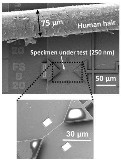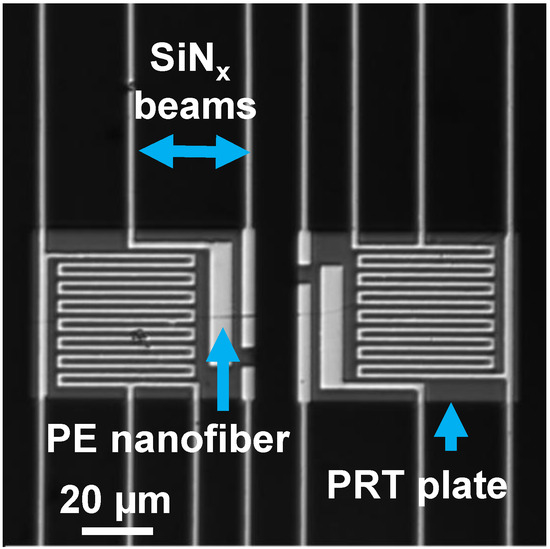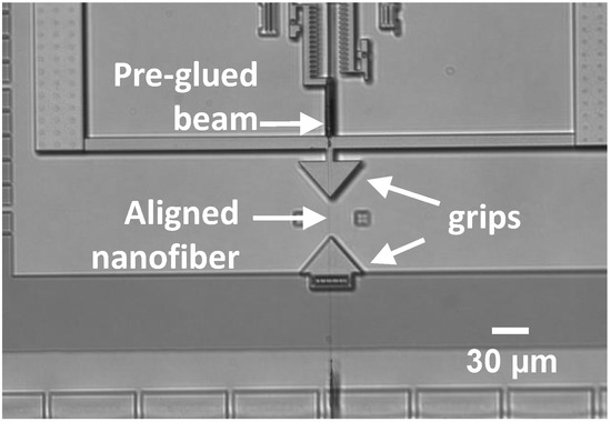 The minuscule sample size, the limited resolution of the optical microscope and nonlinear forces such as van der Waals, triboelectric, and capillary forces due to moisture are factors that make it difficult to successfully place nanofibers with tip-based methods. Yet, it is critical to locate and position the nanofiber precisely onto the micromachined test platform without damaging it. Electron microscopes cannot be used because of the sensitivity of polymer samples to electron beam radiation [29,30], which scissions bonds and hence degrade the mechanical and thermal property enhancement [31,32]. The manipulation by optical methods is preferred. Regarding alignment, during tensile testing, an unwanted bending moment can cause the load cell to rotate and the fiber force will be underestimated.