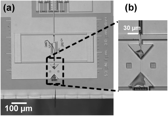 Steps to achieve capillary-assisted adhesion are schematically shown in Figure 9. In this process, an IPA liquid drop was first placed on top of the thermal device (Figure 9b). Evaporation of IPA from the device was closely monitored under the optical microscope. After the liquid meniscus connecting the suspended plates broke, the suspending beams (not shown) cause the plates to separate to their nominal 5–10 µm gap. Before the liquid layer evaporated from the surface of the plates, a pre-aligned nanofiber was expeditiously lowered into focus and contact was made with the pads (Figure 9c). The liquid wet the fiber and the evaporating liquid surface pulled the fiber down due to surface tension. The fiber then adhered to the pads (Figure 9d). This surface tension, accompanied by the van der Waals force, increased the contact width of the fiber on the pads. Also, the fiber conformed to the undulating surface, increasing the contact length significantly. Increased contact width and contact length due to capillary-assisted adhesion reduced the thermal contact resistance. Figure 10 shows an optical image of a mounted nanofiber on the device. NFs that are of a significantly smaller diameter and not resolvable under the optical microscope could be manipulated and mounted onto the test platform.