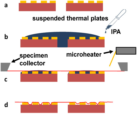 Schematic diagrams representing nanofiber placement onto a platinum resistance thermometer plates. (a) suspended plates, (b) a small drop of isopropanol (IPA) is placed on the platforms (c) after the IPA evaporates, the microheater cuts the fibers, (d) The evaporating IPA pulls the fiber into contact with the plate.