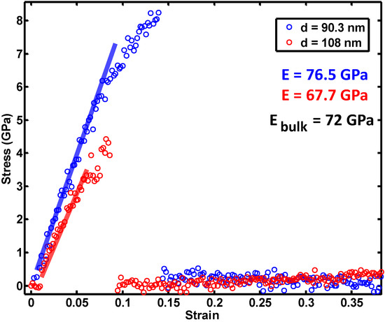 Stress and strain were obtained from the force normalized over the cross-section diameter and elongation over the gauge length. Figure 11 shows the stress–strain curve of a silica nanofiber of diameter 108 nm. The Young’s modulus was obtained from the slope of the stress–strain curve in the elastic region. For that fiber, it was found to be 67.7 GPa. The strength was 4.5 GPa and its elongation at failure was 9%. A second silica nanofiber was also tested with diameter = 90 nm (Figure 11). The Young’s modulus value was 76.5 GPa, while the ultimate strength was 8.2 GPa, twice that of the previous sample. Elongation at failure was also observed to be higher than the previous sample at 13.8%.