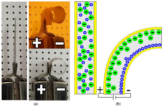 (a) Ionic polymer metallic composite (IPMC) sample before and after electric excitation; (b) representation of IPMC bending actuation mechanism where the initial randomly oriented ions (Li+ and ClO4−) in the poly(ethylene oxide) (PEO) matrix are attracted towards and traverse to their respective electrodes when an external voltage is applied.