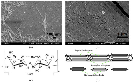 Scanning electron micrograph of: (a) individual H2SO4-based nanocrystalline cellulose (NCC) rods and, (b) PEO electroactive polymers (EAPs) with 5.0 wt.% LP and 7.5 vol.% NCC; (c) cellulose molecule; (d) representation of whole cellulose fiber and resulting nanocrystalline rods after sulfuric acid hydrolysis.