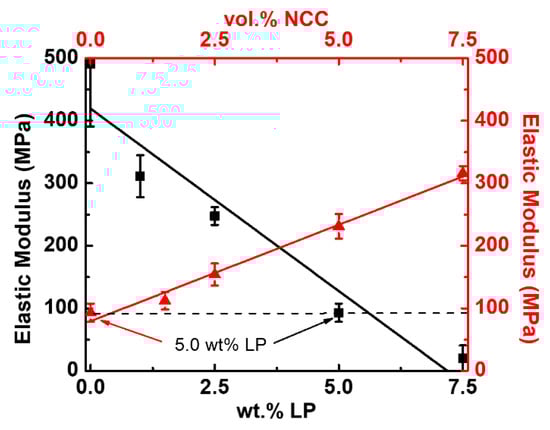 Elastic modulus trending for increasing lithium perchlorate (LP) (black curve with squares, elastic modulus vs. content of LP for PEO–LP) and NCC vol.% (red curve with triangles, elastic modulus vs. content of NCC for PEO with 5.0 wt.% LP) concentrations.