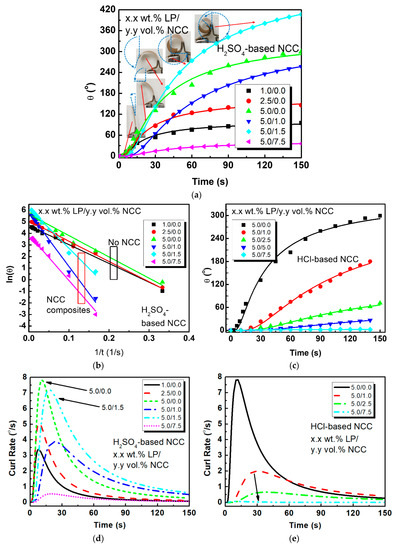 Figure 4a,b shows the fitted time-dependent tip-displacement angle behavior for various PEO-based IPMCs with increasing LP, and for composites with sulfuric acid-based NCC content in linear time and s−1. With increasing LP concentrations, the actuation performance increases. Maximum electromechanical actuation occurred for the 1.5 vol.% NCC composites, where there was an increase in both tip displacement angle and strain of 43.7% and 33.4%, respectively, compared to the non-NCC PEO-based IPMCs at 5.0 wt.% LP. It is of note that with increasing NCC content over 2.5 vol.%, that there is a sharp decrease in the electromechanical response of the actuators; the 7.5 vol.% NCC samples reached only ~30° actuation, with a roughly 0.1% maximum strain. These results indicate that with increasing NCC content, the ionic mobility is reduced in the matrix, which decreases the mechanical actuation. Therefore, finding the right balance of NCC for a given polymer matrix is key for using NCC as a filler material. The inserts in Figure 4a relate what the observed actuator performance was and the corresponding tip displacement angle calculations.