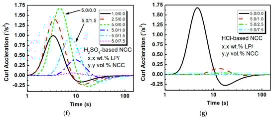 A similar analysis can be concluded when evaluating the ICA between the EAPs, as shown in Figure 4f,g. Virtually all of the films obtain their peak accelerations within the first 10 s, with the 5.0 wt.% LP PEO samples without NCC, and the 5.0 wt.% LP/1.5 vol.% NCC–PEO samples reaching their peaks of 1.7 °/s2 and 0.94 °/s2 in 4.5 s and 7.0 s, respectively. For the best HCl-based NCC composites, they only reached 0.15 °/s2, which again shows the added contribution of the space charge with the H2SO4 samples.
