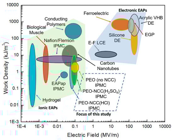 Figure 5 displays the energy density versus the applied electric field for various types of both ionic and electronic EAPs. Using the biologic muscle as a reference, the PEO-based films that were discussed in this study have comparable performance, but require a larger driving voltage. Further investigation into the effects of NCC on the PEO matrix may make it possible to tailor this family of EAPs to behave more closely in line with that of biologic muscle.
