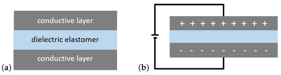 Among the many different types of electroactive polymers, dielectric elastomer actuators (DEAs) are one of the most promising types. DEAs can provide high actuation speed and relatively high actuation forces while maintaining a flexible and stretchable actuator body. A dielectric elastomer actuator consists of three main parts: a dielectric membrane and two conductive parallel plates, one on each side of the dielectric material, as shown in Figure 1. When a voltage is applied, the conductive layers are charged with opposite charges, which creates a Coulombic attraction force. The force compresses the actuator in a perpendicular direction to the parallel electrodes. The elastomeric dielectric material between the conductive layers then expands in the lateral direction to conserve volume.