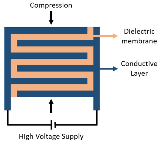 Cross-sectional view of the stacked DEA structure. Interdigitated conductive layers are isolated from each other by the serpentine-shaped dielectric material between. On each side, alternating conductive layers are interconnected and attached to a power source. The actuator is compressed in the perpendicular direction (indicated by the arrows) when a voltage is applied and expands in the lateral direction.