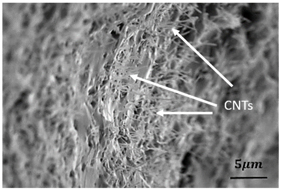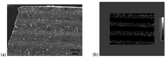 In Figure 3a, an SEM image of a small cross-sectional area taken from the middle of a stacked DEA specimen, with a 50 m layer thickness, is shown. The darker layers are the dielectric PDMS layers and the lighter layers are c-PDMS (MWCNT/PDMS composite). Figure 4 shows a close-up of the conductive composite layer in the stacked actuator structure. The MWCNTs can be seen in the image as they are coming out of the PDMS matrix. Figure 3b shows a cross-sectional image of the stacked actuator that was imaged under the SEM and was edited in ImageJ [34] to provide a perspective on the MWCNT distribution in PDMS and layer uniformity in the actuator.
