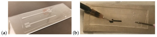 Figure 10a shows the two pieces of PDMS sealed together after the corona treatment step. Two devices in the image were cut from the rest of the PDMS. The needle, attached to the syringe containing the c-PDMS mixture, is inserted into the hollow area that forms the electrode connection for the power input. Another needle is inserted from the opposite end, as shown in Figure 10b, to introduce vacuum into the chamber.