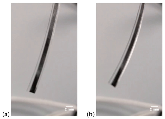 Using Method II, it is observed in Figure 11b that the actuation occurs as a combination of compression and bending. This is due to the difference in thickness of the PDMS layers on each side of the actuator. The compression force is more effective on one side of the actuator while it is inhibited by the counteracting stress caused by the thicker PDMS layer on the other side. This can be adjusted by fine-tuning the coating parameters on either side of the structure. When the thickness is uniform and equal on each side, the device should only contract, while it is also possible, as shown in the figure, to introduce a bending mechanism by changing the thickness on either side.