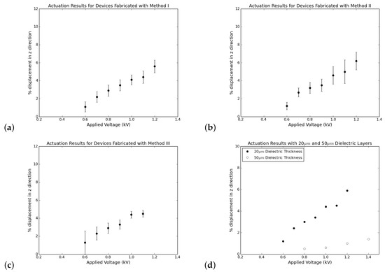 Actuation results for the devices fabricated through (a) Method I, (b) Method II, and (c) Method III. (d) The actuation ratios of devices with dielectric layer thickness of 20 and 50 m. Error bars indicate the standard deviation of the measurements in (a, b) and indicate instrument accuracy in (c).