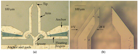 The microsystem considered in this paper consists of two silicon arms actuated by rotary comb drives, as shown in Figure 1. The electrostatic actuators exert the input torques that, through the conjugate surface flexure hinges (CSFH) deflections [35,36], move the arms from the initial position to perform the gripping task [37]. In the neutral configuration, the distance between the jaws is equal to 150 m. The fabrication method relies on the application of deep reactive-ion etching on silicon-on-insulator wafers [38].