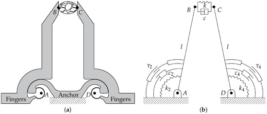 In operative condition, the microdevice is gripping a sample between its jaws, as illustrated in Figure 2. More specifically, Figure 2a shows a schematic drawing of the compliant structure of the gripper. The contact points between jaws and sample are labelled as B and C, whereas the points A and D represent the centers of rotation of the left and right arms, respectively. Starting from the compliant mechanism, a pseudo-rigid body model (PRBM) can be obtained by substituting the constant-curvature CSFHs with revolute joints [35,40,41,42]. Figure 2b shows the PRBM of the microgripper: the quadrilateral is a closed chain composed by the links (frame), and (arms), and (sample). All the links have a fixed length with the exception of , whose compression is at the basis of the measurement procedure. The proposed model takes into account the nonlinearity related to the kinematics of the gripper, but it assumes a linear behavior for stiffness coefficients and . Moreover, the identification of the cell parameters inherently assumes that its dynamic behavior can be described by the Kelvin–Voight constitutive model of viscoelasticity.