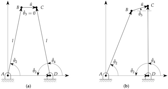- l is the common length of the two links representing the arms, i.e., the distances and ;