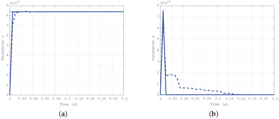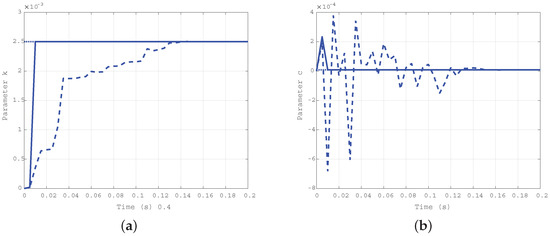 The results obtained by simulation of the third case ( Nms/rad and Nm/rad) are reported in Figure 6a for the elastic coefficient k, and in Figure 6b for the damping one c. The difference in the convergence rate for the two approaches is confirmed, and uniformity in the estimation of the damping coefficient c with the two algorithms is the same as in the first case.