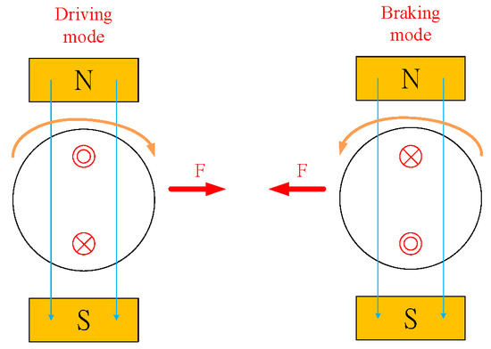 To explain, consider Figure 1, which reveals the Ampère’s circuital law for a DC motor during driving or braking with F denoting the force generated by the motor. When the electric vehicle is operating in the driving mode, force direction of the rotor’s magnetic field is clockwise. Force direction of the rotor’s magnetic field becomes counter-clockwise when the electric vehicle works in the braking mode.