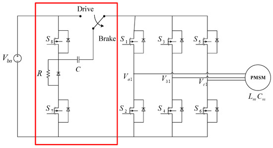 The paper in Reference [13] proposed an identification technique of the parameters that are needed to minimize power consumption of a city-bus equipped with permanent magnet synchronous motors (PMSMs). The MSMs have no torque ripple at commutation, possess higher torque (comparing to brushless DC motor (BLDCM)), and have the potential for extensive use in the future [14,15]. On the basis of this advantage, we select PMSMs as the test object in this research. The paper in Reference [16] proposed a regenerative braking system that considers the effects of single switch and double switch that can recycle a relatively large amount of energy to extend the life cycle of electric vehicles. In References [1,2], short circuit brake has been explored; the studies proposed that the under-bridge short circuit braking causes a complete consumption of the back EMF in the motor coils and enables dynamic braking simultaneously. Our proposed design here is different from the conventional approaches that apply only the back EMF to generate braking force. Our proposed system resolves the problem by introducing an energy boost mechanism to reduce the performance dropping rate in the conventional regenerative braking design. In addition, the motor driver and brake driver share the same inverter that meant low cost. Theoretical analysis is developed in this paper and real-world experiments are conducted to verify the proposed design, in comparison to the traditional approaches.