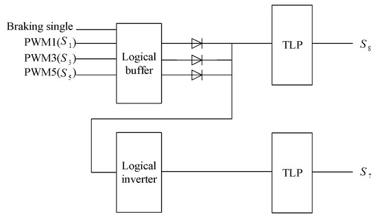 The controller shown in Figure 3 controls switching status of and . The controller is activated and deactivated by the braking signal. When the controller works PWM1 (), PWM3 (), and PWM5 () are combined to control a logical buffer. The outputs of the logical buffer are combined and used to isolate the breaking signal from other signals. It is transmitted to a TLP to control . Furthermore, the signal is used to activate a logical inverter and then connected to a TLP to control .