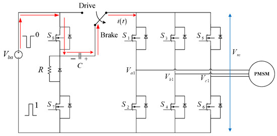We only focus on the braking operation in this research. Consider the first step of braking operation, the relay is cut off by the braking command, is disabled, and is enabled and the back EMF generated by the motor induces braking current is illustrated, as in Figure 4. The back EMF proceeds to charge the pump capacitor C via the way indicated in the figure. Related variables and parameters are listed in Table 2.