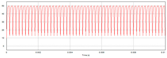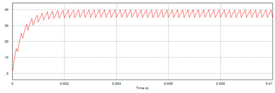 For the simulation purposes, considering the duty cycle D being 75%, the sampling period T is 0.2 msec, the resistance is 20 Ω, the motor internal resistance is 5.6 Ω, the motor inductance is is 22 mH, for all i. We simulate charge and discharge statuses of the capacitor during braking. As mentioned, the MOSFETs and are controlled by the PWM command of 5000 Hz to charge and discharge the capacitor. Consider the back EMF to be 50 V. The PWM command uses 75% duty cycle for capacitor charging, and 25% duty cycle for discharging. Figure 7 and Figure 8 illustrate the simulation results of the capacitor’s voltage, where the capacitance is 20 μF and 200 μF, respectively, and the resistance of R is 20 Ω. Note that the peak voltage of the case of capacitance of 200 μF is lower than that of 20 μF because the current setting of duty cycle of the PWM command is not enough for the larger capacitor fully charged to the supply voltage.