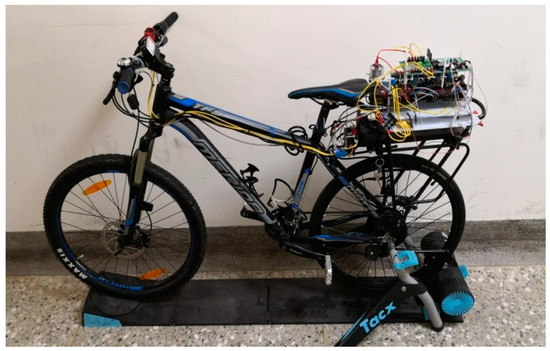 The electric bicycle was tested on the TACX I-Genius T2000 bike simulator [17]. The simulator is designed as a virtual reality experimental platform for bike trainers. The interactive trainer is equipped the Tacx Trainer software where users can choose from various animated terrains for mountain bike, race, and track with virtual 3D riders. Several data are provided like bike speed, time, road slope, distance, and power. What we need in this research work are just speed, time, slope, and distance. We perform hardware-in-the-loop (HIL) experiments by including all hardware, software, and the simulator with respect to two kinds of road condition including smooth flat road and smooth downhill road of a −5% slope. The arrangement helps us to understand the behavior of the proposed braking control design in an efficient way. In which, the bike simulator is equipped with an active resistance unit driven by a DC motor to generate the effect of riding uphill or downhill. During a hill climbing, the resistance at the rear wheel increases accordingly. While going downhill, the speed of the active resistance unit will be increased to emulate the riding downhill scenarios. The testing environment can be found from Figure 9. We verify braking performance of the active regenerative braking control system by implementing it in a customized electric bicycle. The bicycle has a drum direct-drive motor with 20 poles and three 120° Hall sensors installed in the rear wheel. The friction brake has been removed from the rear wheel. Driving and braking processes are controlled solely by electricity.