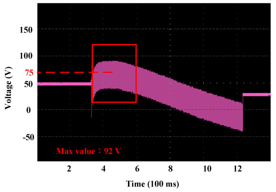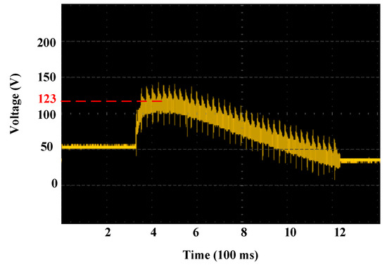 For high-speed inertial rotation of the motor, it generates larger back EMF. While adding the back EMF to the fully charged capacitor, the instantaneous voltage is boosted to the peak value of 123 V, without the need of external power, as shown in Figure 11.
