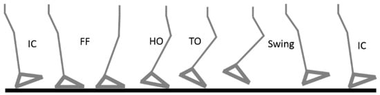One daily activity task is locomotion, which defines the way in which humans move from one place to another. The ability of locomotion, such as walking, is crucial for avoiding anti-social behavior and anxiety over the loss of mobility []. Therefore, locomotion is one of the primary tasks to be acquired by a post-stroke patient, in addition to hand motions [] and speech []. The basic form of locomotion is walking, besides running, jumping, and so on. The walking gait is a quasiperiodic activity, as depicted in Figure 1. It starts from the initial contact (IC) on the heel. The foot goes down until the toe touches the ground. This is known as the foot flat (FF). From here, the leg moves forward along with the body. At the end of the FF, the foot pushes the ground with a sequence of heel-off (HO), then, toe-off (TO) movements. The body moves forward further because of the push from the foot. The foot is swung in the air before the next initial contact. However, the walking gait may be disturbed due to stroke symptoms. For instance, foot drop causes an inappropriate foot position during the swing phase, which leads to the IC being on the toe instead of the heel. In the worst case, the patient may even suffer from an inability to swing the foot at all. Therefore, training for a normal walking gait must be done to recover the patient’s walking gait.