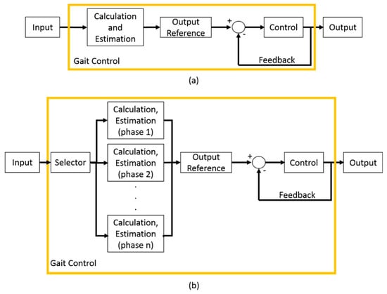 Based on the estimation method for the controller output reference, the control strategies can be categorized into two groups, namely, subject-oriented (Figure 2a) and phase-oriented (Figure 2b) control types. The subject-oriented control strategy considers that the subjects will have different output references. For instance, patient A will have a different body weight from patient B, and thus, the output reference for the ankle stiffness of the AFO for each patient will not be the same []. On the other hand, the phase-oriented control strategy considers the gait to be divided into several phases. Then, the control output reference is treated differently according to the current ongoing phase selected by the selector. For example, the ankle stiffness is maximized to lock the foot in the swing phase, and is minimized to allow forward propulsion in the stance phase []. Both control strategies have their own pros and cons. The subject-oriented control strategy is more complex, but it involves only one calculation, because it must consider the entire walking gait. On the other hand, the phase-oriented control has more calculations due to the number of gait phases, but these are relatively simpler calculations. These must be considered because they will affect the type of equipment, sensing units, and actuators.