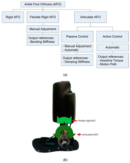 Based on the structure of the joint, AFOs are classified as rigid AFOs, flexible rigid AFOs, and articulated AFOs, as shown in Figure 3. Initially, the AFO was made to assist the dorsal flexion during the swing phase by having a fixed rigid ankle joint. Thus, it was called a rigid AFO. The lack of dorsal flexion during the swing phase led to an inappropriate IC in the next stance phase, thereby giving rise to the risk of stumbling. Although dorsal flexion was successfully assisted, however, the forward ability during the stance phase decreased significantly []. Then, researchers improved on the AFO by giving it a controllable ankle joint, thereby giving rise to the flexible rigid AFO and articulated AFO. The flexible rigid AFO is made of a material that can bend, such as polypropylene []. Thus, the mechanical properties can be adjusted according to certain stiffness levels. Examples of the qualitative terms used to represent the stiffness levels include flexible, semi-rigid, and rigid []. Although, the flexible rigid AFO has no effect on the power output of the limb in the horizontal axis [], it affects the power output in the vertical axis because of unnecessary restrictions on the plantar flexion, which is comparable to the rigid AFO [,]. Meanwhile, the articulated AFO is equipped with an actuator for controlling the mechanical properties according to the gait control strategy, and thus, it is more useful compared to the flexible rigid and rigid AFOs [].