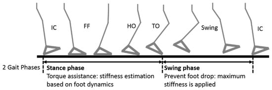 In general, a gait may be classified into two phases, the stance phase (phase 1) and the swing phase (phase 2), as shown in Figure 4 [,]. In other existing works, the swing phase remains the same, but not the stance phase. The sequence for the contact between the foot and the ground can be further classified as IC to FF (phase 1, heel strike), FF to HO (phase 2, mid/forefoot strike), and HO to TO (phase 3, foot-off), thereby making it a 4-phased gait classification by the addition of a swing phase [,]. Another reported gait classification treats phases 2 and 3 in the 4-phased gait as a single phase, thus giving rise to a 3-phased gait classification in total: IC to FF (weight acceptance), FF to TO (stance termination), and a swing phase [,,]. Not only is the gait phase classification addressed, but some reported control strategies include a walking mode classification such as sitting, standing up, and walking []. In another work, the incline walking and ascending–descending stairs are also considered in the control strategy []. The implementation of a walking mode has a wider application for gait control. However, it may need additional sensors for detection, thus increasing the complexity of both the structure and the algorithm.