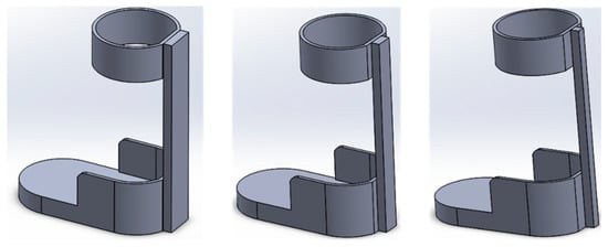 A bending stiffness control was implemented on a flexible rigid AFO. The AFO was able to bend to a certain degree as such AFOs are made from a thermal plastic material such as polypropylene [,], and carbon fiber []. The works reported AFOs with different bending stiffness values such as 0.19 N·m [] and 2.52 N·m []. Both bending stiffness values, which were not estimated and tested, showed that the AFO was not beneficial for all of the participating subjects. Therefore, the bending stiffness of an AFO should be controlled according to the needs of the user to optimize the benefits of using the prescribed AFO. The bending stiffness can be varied (i.e., 50%, 100%, and 130%) by changing the strut width, as shown in Figure 5.