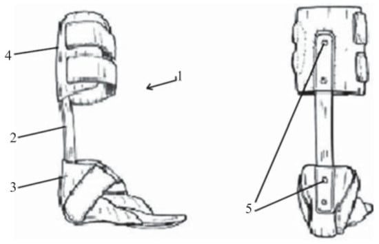 AFO with a strut module system: (1) Velcro strap; (2) strut module; (3) foot plate; (4) shank holder [].