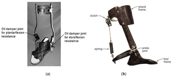 AFO with damping stiffness control. (a) Oil damper []; (b) spring [].