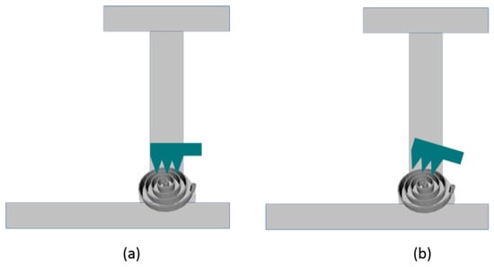 It has been reported that a spring can also be used as an actuator to control the ankle joint stiffness, as depicted in Figure 7b. A spring has damping characteristics, and it is much lighter than an oil damper. It can store and release energy, and as such, it is able to assist the gait in both the dorsiflexion and plantar flexion directions []. Therefore, when a spring is utilized [], the spring constant is the sole output reference that needs to be estimated and controlled accordingly. The spring constant may be controlled either by stretching it or even by changing the spring modulus []. Moreover, combinations of two or more springs can be used to add more variations of joint stiffness []. For instance, one spring was located at the front and one at the back of the foot, as shown in a study by Kobayashi []. Thus, it can be used to optimize the mechanical properties of an AFO for the individual gait treatment of post-stroke patients [].