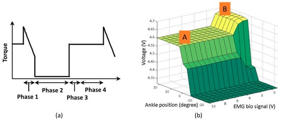 Not only actuators, but also sensors, such as a rotary encoder [,], accelerometer [], foot switch [], and electromyography (EMG) [], are used together with AFOs for physical and biomedical data measurements. This information provides insights to therapists for improving stroke rehabilitation []. In terms of the gait control strategy, the information from the sensors can be utilized for the detection of the gait phase.