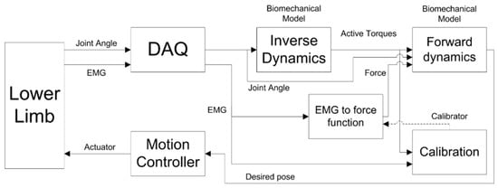 EMG-force model for the desired position estimation []. A biomechanical model was used for the inverse and forward dynamics. Calibration was done on the EMG to force the function.