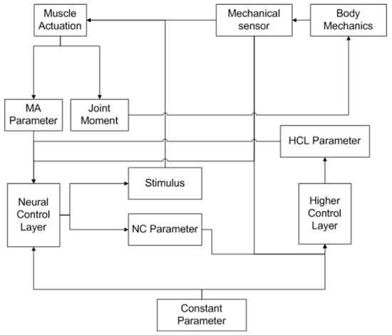 Neuromuscular control strategy framework []. There are four main parts: muscle actuation, body mechanics, neural control and higher control layers.