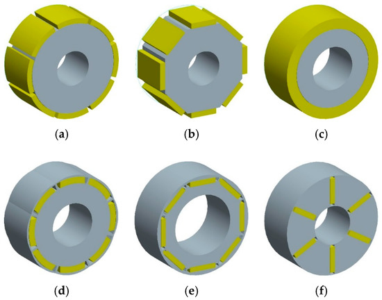 Overview of parametrized PM rotor topologies used in design optimization; (a) arc surface mounted magnets; (b) rectangular surface mounted magnets; (c) ring magnet—special case of arc surface mounted magnet; (d) buried arc magnets; (e) buried rectangular magnets; (f) internal magnets.