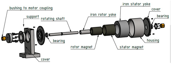 In order to validate the above described modeling approach, a prototype of a magnetic spring has been built (Figure 6). A magnetic spring consists of two diametrically magnetized ring NdFeB, N42H magnets, one on the stator and one on the rotor, with soft magnetic back iron to prevent flux leakage. For testing modularity, the spring has a built-in deep groove ball bearing. The bearing adds to the losses in the magnetic spring, which should be avoided in future designs, with a higher level of spring integration into the existing drivetrain.