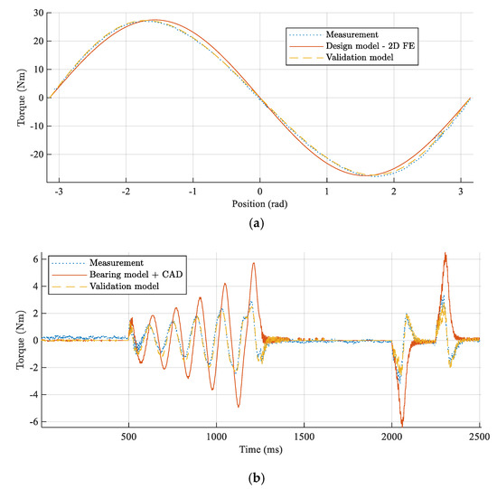 The measurement results (Figure 8) show a good qualitative and quantitative fit of the static measurement and a good qualitative fit with respect to the low loss hypothesis. In Figure 8a, a slight skewing of the sinusoidal curve is visible. This phenomenon is related to the eccentricity of the magnetic center of design and the mechanical rotation axis due to the manufacturing tolerances and it can be captured in static stiffness modelled as a skewed sine due with single order eccentricity