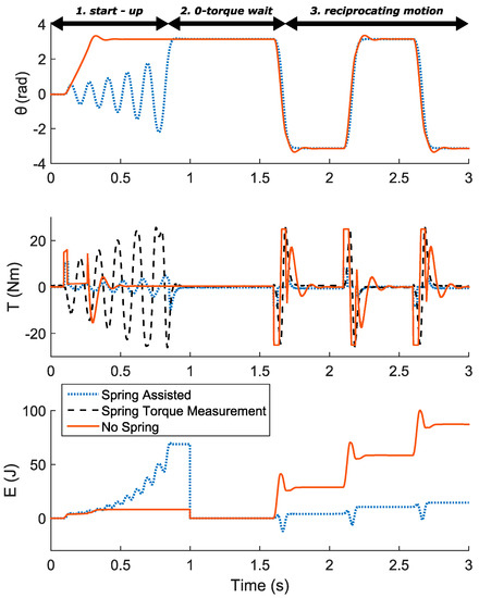 It is visible that initially, during the start-up, the energy required to initialize the spring assisted setup is higher. This is, however, not a serious downside of the spring assisted actuator, considering that in the industrial application cases the drivetrain is only seldomly initiated, before long hours of operation, making the start-up energy consumption a negligible segment of the total energy consumption. For this reason, and for the convenience of tracking the energy consumption during the operational behavior (Figure 9, phase 3, reciprocating motion) the plotted energy is reset in the middle of the experiment (Figure 9, Phase 2, 0-torque wait. Alternatively, it is also possible to run the spring assisted system at a much higher torque in order to achieve a faster transient than it is possible with the motor only. In that case, a bang-bang controller can be used to accelerate the load as quickly as possible between two end positions.
