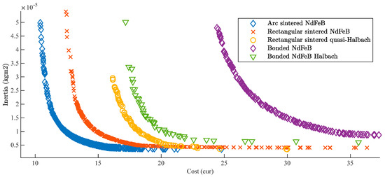 Detailed design optimization of the selected five most interesting topologies was done. The resulting Pareto fronts of different magnetic spring topologies can be compared for a fixed energy requirement and stroke. In Figure 10 it can be seen that sintered NdFeB is preferred over bonded magnets for reasons of both lower cost inertia. The added effect of using isotropic material (bonded NdFeB) to achieve a wider variety of magnetization is smaller than the added cost and inertia that results from lower flux densities in these materials. Interesting enough, low inertia levels can be achieved for each topology, irrelevant of the magnet geometry. However, the amount of material required to do so results in the lowest cost design with surface mounted arc magnets.