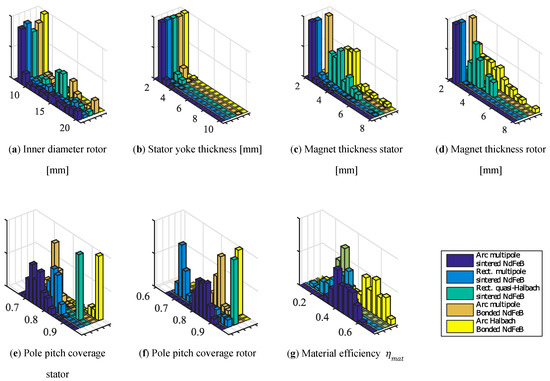 Further analysis, shows that pole pitch in quasi Halbach arrays is optimally fully pitched with pitch factor values (i.e., the ratio of magnet coverage and pole pitch) approaching 1 (Figure 11e,f), which results in closest possible design to a real Halbach magnetization. On the other hand, standard multipole array values optimally have short pitchpoles with pitch factor values between 0.75 and 0.85 in order to prevent short-circuiting of the permanent magnet flux. The specific value of pitch factor, in this case, depends on the magnetic air gap between stator and rotor magnets as this represents the magnetic resistance of the parallel flux path. Another difference between Halbach and standard multipole arrays is in the thickness of the magnets (Figure 11c,d).