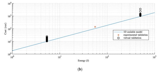Validation of 1D scaling model for (a) magnetic spring inertia and (b) magnetic spring bulk material cost using experimental data and virtual validation data.