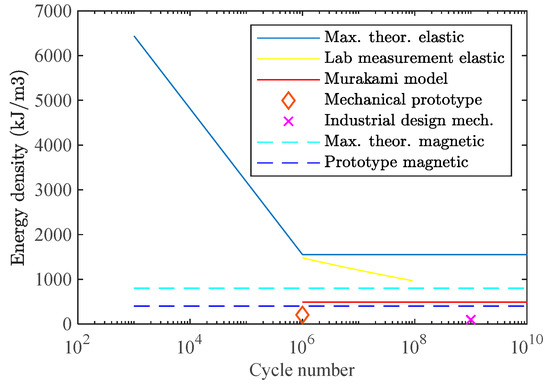 The maximum theoretical energy density of the magnetic spring of is already higher than that of the Murakami model based gigacycle energy density of steel springs at . The difference between feasible energy density achieved with the feasible designs is even more dramatic. With NdFeB 42H grade and arc magnets, we are able to design a magnetic spring with an energy density of , while a specific mechanical spring described in Reference [9] possesses an energy density of with possible fatigue failure already at megacycles. However, it is difficult to generalize on feasible gigacycle mechanical designs for all the designs as the range of safety factors used within these applications is usually in quite a large range. Nevertheless, while being conservative we can say that the resulting increase in energy density is at least 50%, considering that the minimax design efficiencies of 0.6 achieved in this paper are larger than those in mechanical spring designs where safety factors are usually moderately higher than 2. Consequently, magnetic springs are specifically relevant for highly dynamic drivetrains in manufacturing machines e.g., a weaving loom operating shedding frames at 10 Hz reaches into megacycles after only 27.8 h and reaches well into a gigacycle regime in its standard operational age.