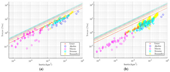 and . In Figure 14a only peak torques are considered, which are limited by the magnetic design of motor and spring. This results in a misleading image of rather “smaller” PMSMs (Maxon) having a higher torque density than magnetic springs with one or even two pole pairs. Note that for these “smaller” motors with natural cooling the difference between nominal torque and the peak torque is also greater. Figure 14b presents a more relevant image for highly dynamic industrial applications since here the nominal torque provided by the motor is compared to the spring peak torque.