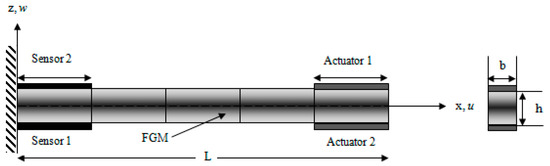 Consider a beam of length L in the x-direction, of rectangular section with the width b in the y-direction and the thickness h in the z-direction, as shown in Figure 1. The beam consists of a functionally graded material composed of metal and ceramic, partially covered by four piezoelectric, actuators, and sensors, which are bonded to the upper and lower faces of the FGM core [].